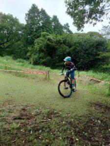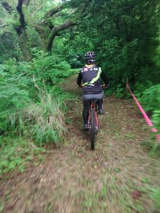シングルトラックは湿った木の根っこや切り株が点在し、シケインのような低速セクションはテンポ良く通過しないと足をついてしまったり、コース後半の芝生エリアの上り坂は見た目以上に重く脚をもっていかれるなかなか走りごたえのあるコースです