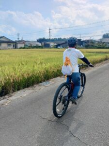 当店の周辺の田んぼは稲刈りシーズン、黄色い稲穂や刈り終わった田んぼを眺めながらぶらりサイクリングを楽しめます
