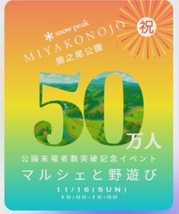 11/16  (日)   スノーピーク都城 50万人突破記念イベント に出店 (10:00 ~ 16:00 都城市関之尾町)雨天時は出店中止 ⇒ 未定(後日お知らせ)