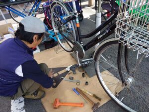 自転車の点検、修理作業とオリジナルグッズの販売を行います